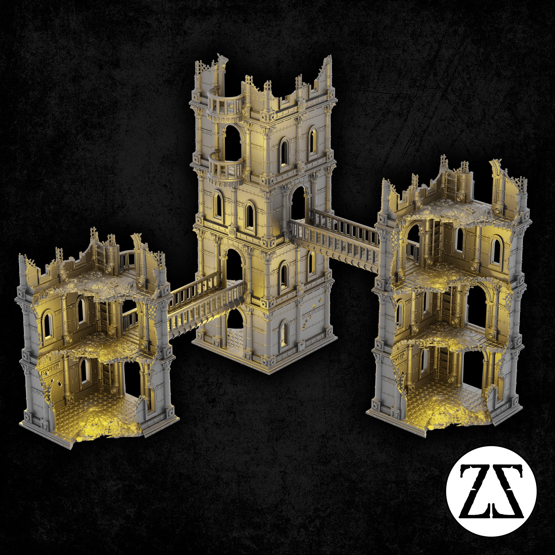 - Version en ruine : passerelle fournie, interchangeable avec un balcon, permettant de relier la tour à d’autres bâtiments de la gamme.